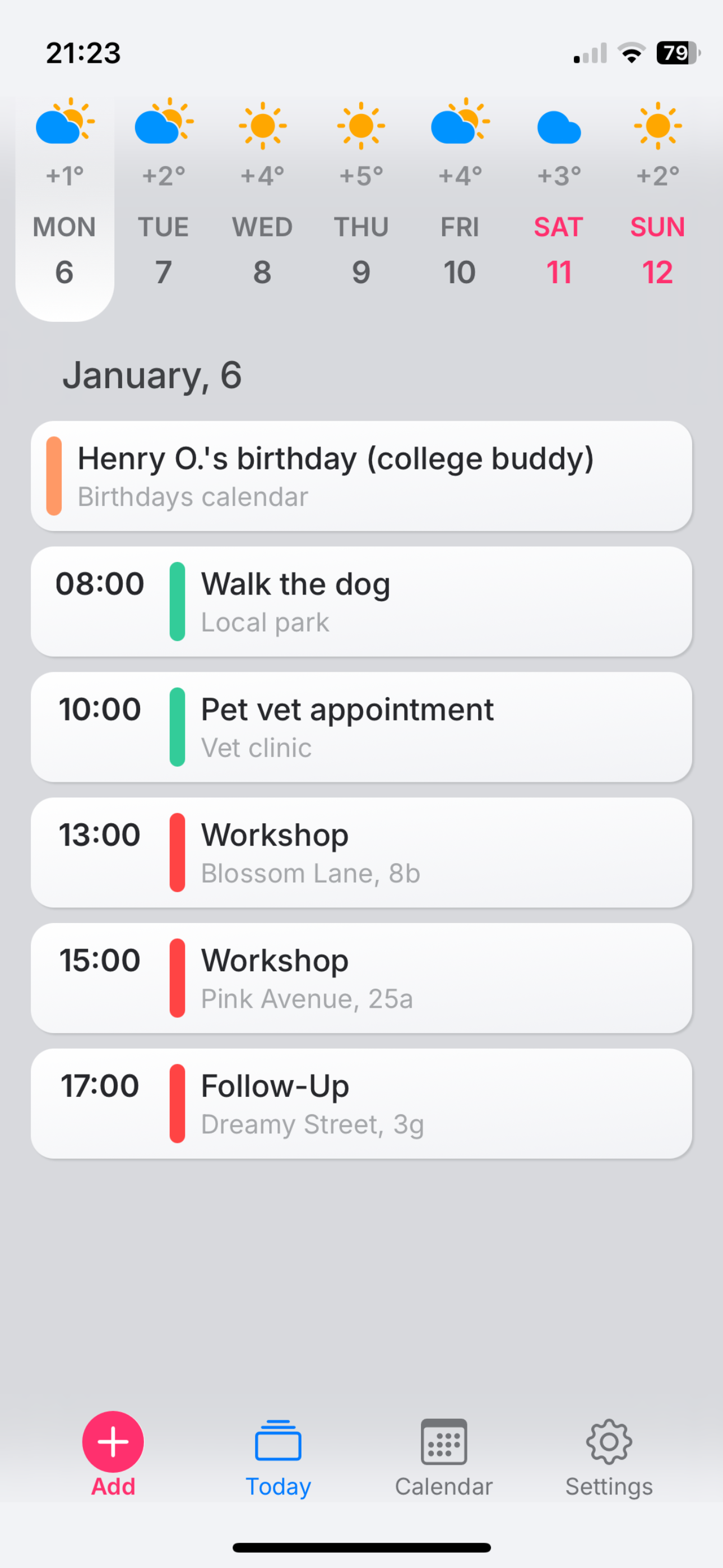 Weather layer with temperature and visual conditions helps to see whole picture of your week.