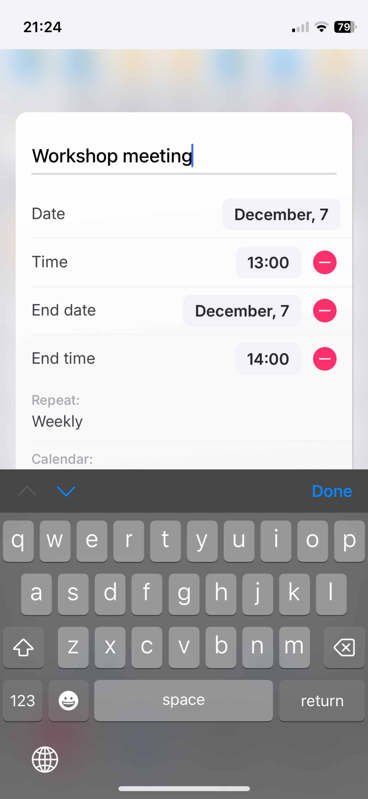 CRUD for events. Support for basic recurring events (daily, weekly, monthly, yearly). All-day or time-specific events.